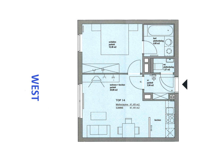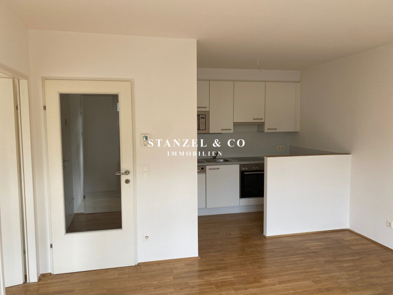 Vom 3m² großen Vorzimmer gelangt man in das westseitige 21m² Wohnesszimmer mit offener Küche. Die Küche ist ausgestattet mit einem Ceranfeld, Backrohr, Dunstabzug, Mikrowelle, Geschirrspüler und einem Kühlschrank + Gefrierfach. Das 12m² große, westseitige Schlafzimmer ist hell und das anschließende Badezimmer ist mit einer Wanne, Waschtisch + fliesenbündigem Spiegel, Waschmaschinenanschluss, Handtuchtrockner sowie einer elektrischen Entlüftung ausgestattet ist. Des Weiteren gibt es ein separates WC mit Handwaschbecken und elektrischer Entlüftung.