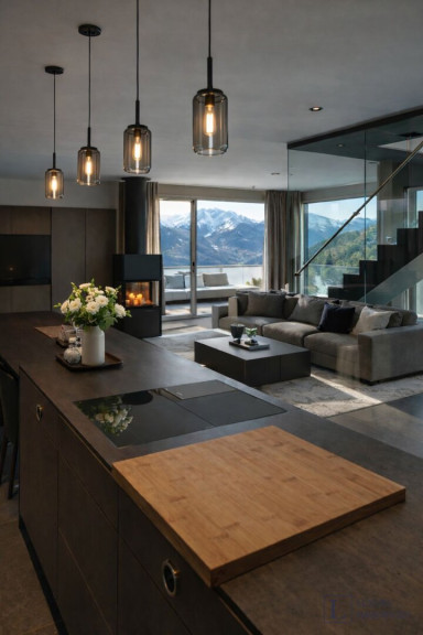 Mehrere großzügige Schlafzimmer mit beeindruckenden Ausblicken sowie moderne Badezimmer mit klarer, funktionaler Gestaltung gehören zur Ausstattung. Der zentrale Wohnbereich mit Kamin lädt zum Entspannen und zum geselligen Beisammensein ein. Großzügige Terrassen und Außenbereiche erweitern den Wohnraum und ermöglichen es, die Natur in vollen Zügen zu genießen.