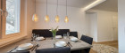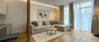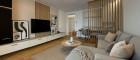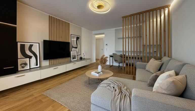 Wohnzimmer mit Designer Tischlermöbeln, ansprechenden Raumteiler und Zugang zum Balkon