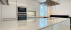 Küche mit Kücheninsel, hochwertigen Markengeräten und gemütlicher Sitzecke