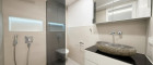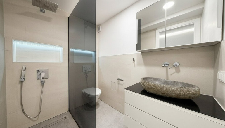 Badezimmer mit Walk-In-Dusche, hochwertigem Steinwaschbecken und WC