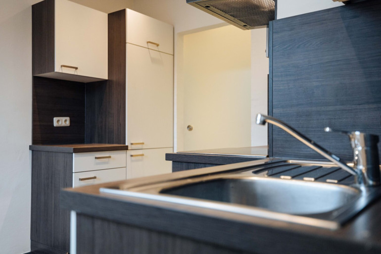 Die Glas-Schiebetür offenbart eine vollausgestattete, moderne Küche, die nicht nur durch ihre Ausstattung, sondern auch durch die optimale Beleuchtung und die gemütlichen Sitz- und Essmöglichkeiten überzeugt. Hier werden Kochen und gesellige Abende zum wahren Vergnügen. Das elegante Badezimmer mit Eckdusche, Waschbecken mit Spiegelschrank und einem praktischen Waschmaschinenanschluss fügt sich nahtlos in das moderne Gesamtbild ein.