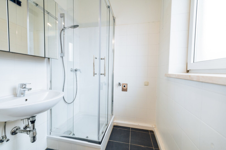 - Elegantes Badezimmer: Ausgestattet mit einer Eckdusche, Waschbecken mit Spiegelschrank und einem Waschmaschinenanschluss, präsentiert sich das Bad in einem modernen Schwarz-Weiß-Design.