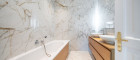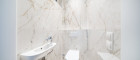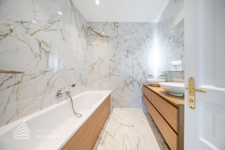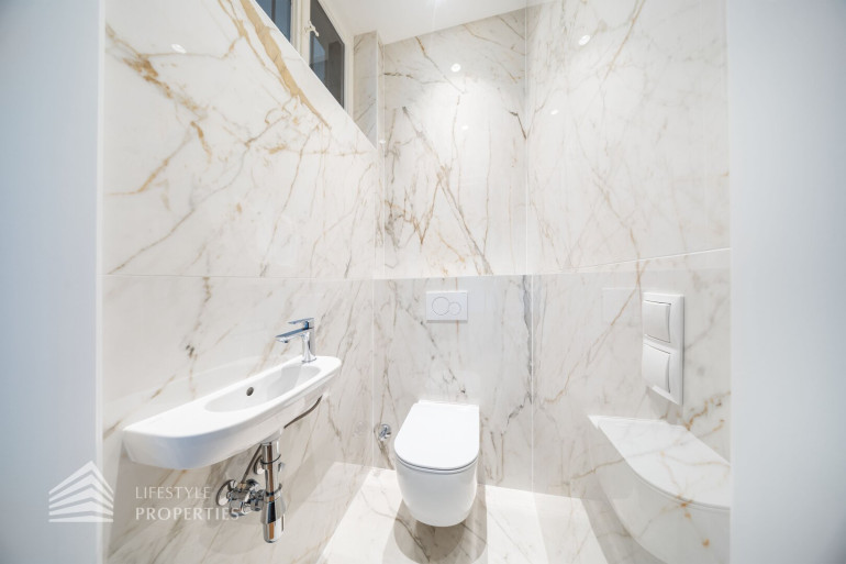 Bereits beim Betreten eröffnet sich ein einladender, rund 6 m² großer Vorraum, der einen ersten Eindruck der hochwertigen Ausführung vermittelt. Linkerhand befinden sich ein separates WC sowie ein praktischer Abstellraum, die funktional und elegant in das Gesamtkonzept integriert sind. Rechterhand liegt das großzügige Masterbedroom mit ca. 24 m², welches als privater Rückzugsort konzipiert wurde. Direkt angeschlossen befindet sich ein luxuriöses Badezimmer en suite mit Badewanne und Doppelwaschbecken, ausgeführt mit edlen Materialien und stilvollen Marmordetails.