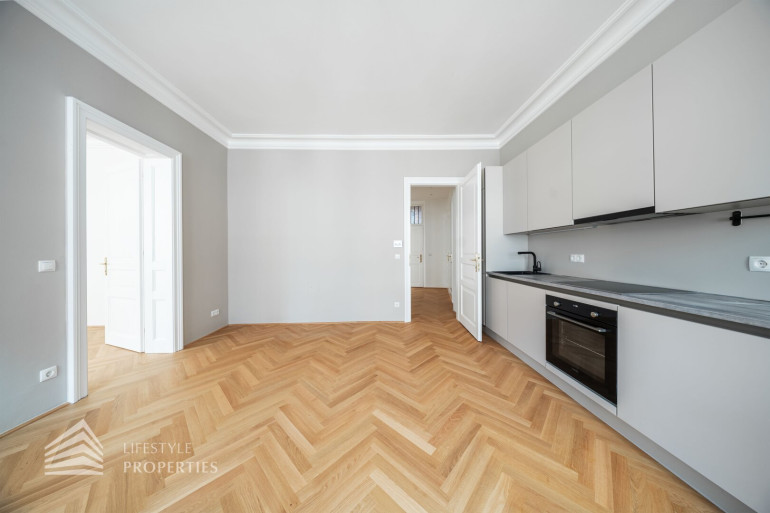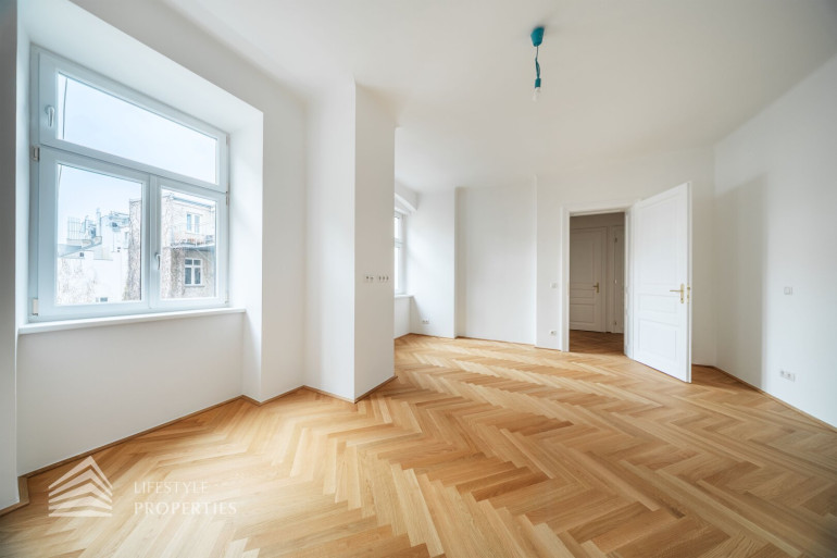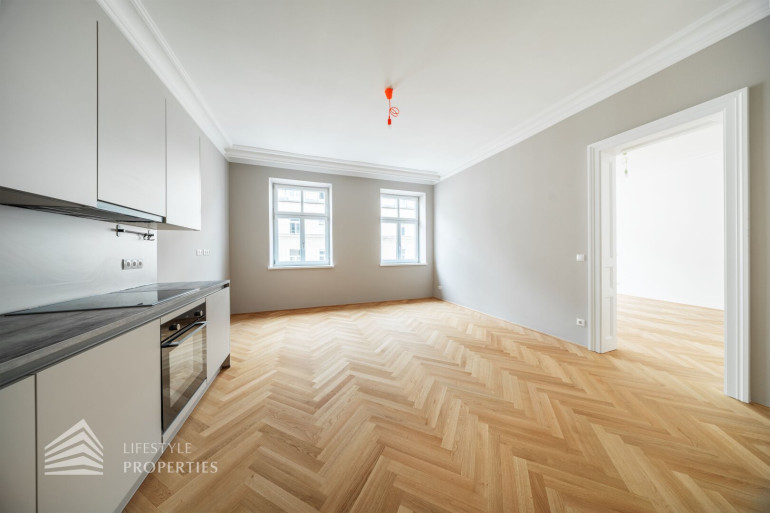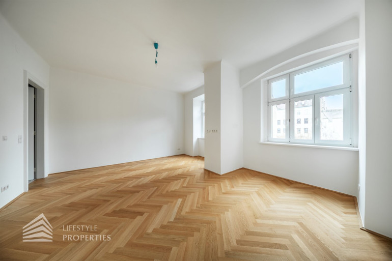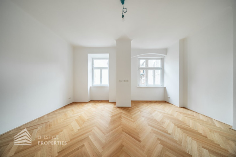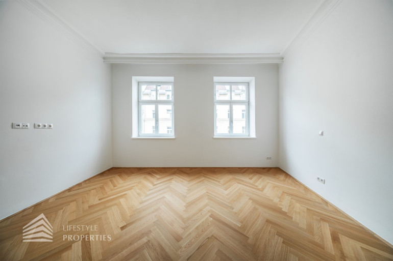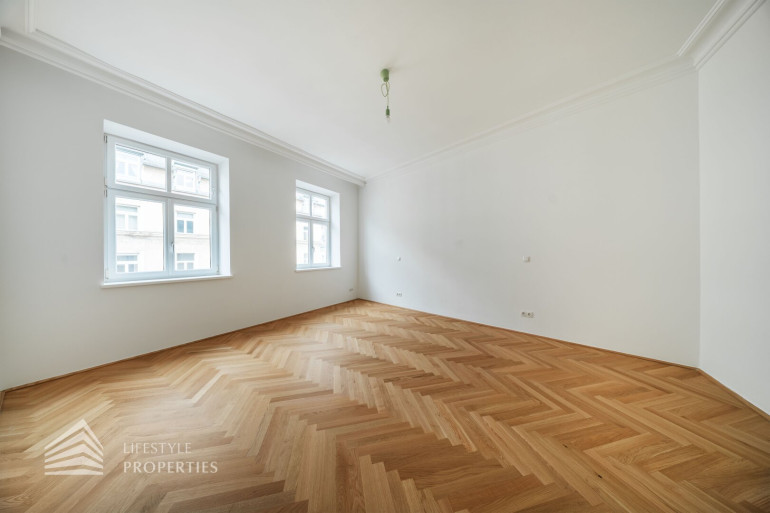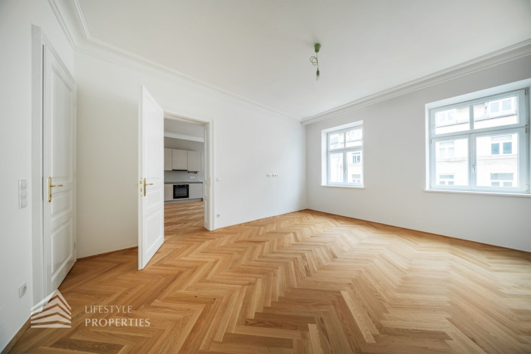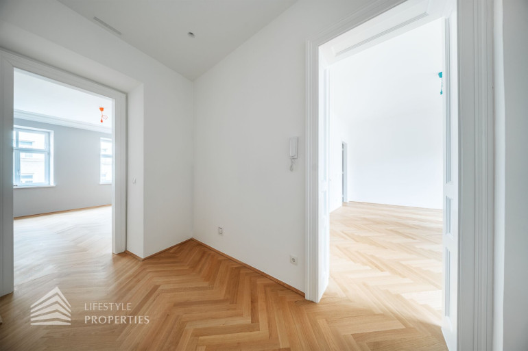 Diese außergewöhnliche Wohnung befindet sich im 3. Obergeschoss und vereint durchdachte Raumplanung mit hochwertigster Ausstattung und präsentiert sich als stilvoller Erstbezug in einem eleganten Altbau. Die Wohnfläche von ca. 91 m² teilt sich auf in eine Wohnküche, zwei Zimmer, 2 Bäder, einen Vorraum, ein separates WC und einen Abstellraum. Die Wohnung überzeugt durch ihre klare Struktur und bietet mit zwei vollwertigen Masterbereichen ein außergewöhnliches Maß an Komfort und Privatsphäre – ideal sowohl für Eigennutzer als auch für anspruchsvolle Investmentzwecke. Edles Fischgrätparkett, hochwertige Materialien sowie fein abgestimmte Design-Highlights verleihen der gesamten Wohnung eine zeitlose, luxuriöse Atmosphäre.