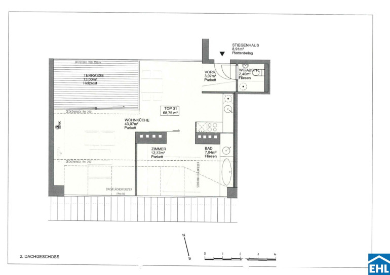 Parkett, Fliesen, Gas, Etagenheizung, Fußbodenheizung, Einbauküche, Wohnküche / offene Küche, Personenaufzug, Nordbalkon, Badewanne