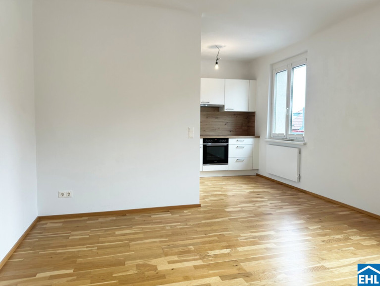 Die Wohnfläche gliedert sich in eine großzügige Wohnküche, ein ruhiges Schlafzimmer, einen praktischen Abstellraum, ein Badezimmer, ein separates WC sowie einen einladenden Vorraum.