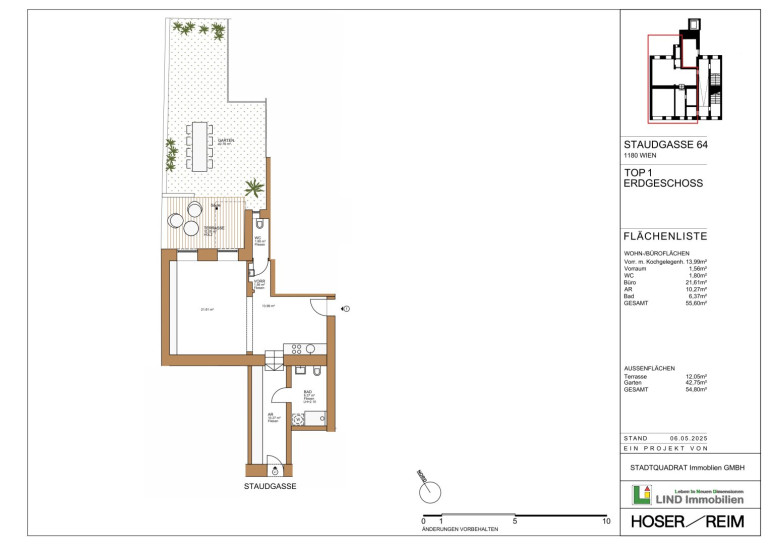 Die Wohn- oder Büroimmobilie mit 55,60qm liegt im Erdgeschoß, mit Terrasse und Garten komplett ruhig in hofseitiger Ausrichtung.