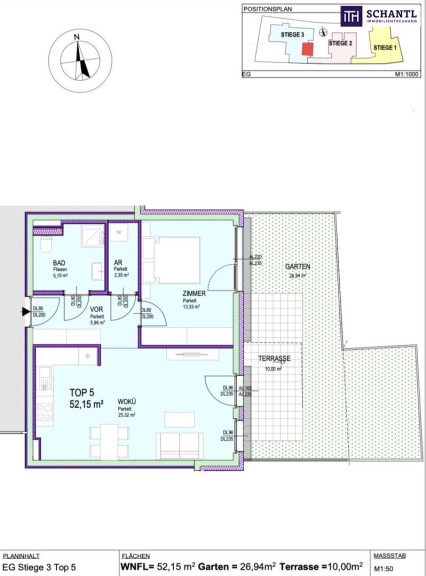 Wohnfläche: ca. 52,15 m² + Terrasse: ca. 10 m² + Garten: ca. 30 m² + Kellerabteil