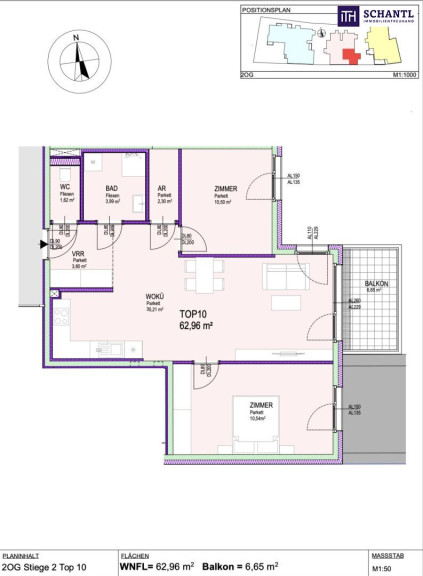 Wohnfläche: ca. 62,96 m² + Balkon: ca. 6,65 m² + Kellerabteil