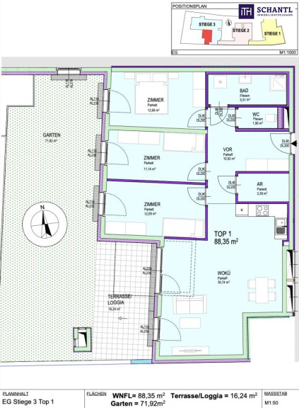 Wohnfläche: ca. 88,35 m² + Terrasse: ca. 16,24 m² + Garten: ca. 71,92 m² + Kellerabteil