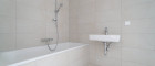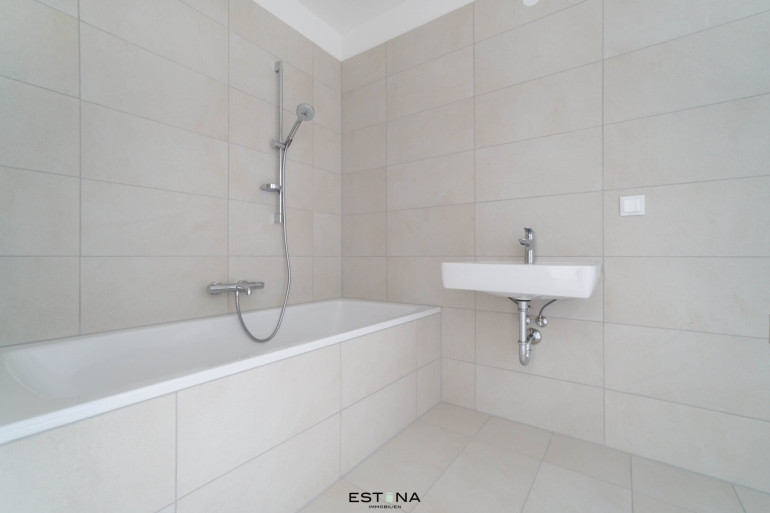 - Badezimmer mit Badewanne, Waschbecken und Waschmaschinenanschluss