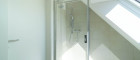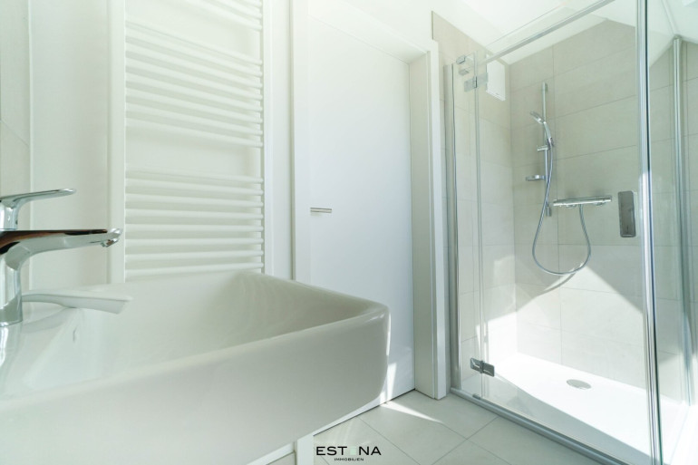 - Badezimmer mit Dusche, Waschbecken und Waschmaschinenanschluss