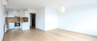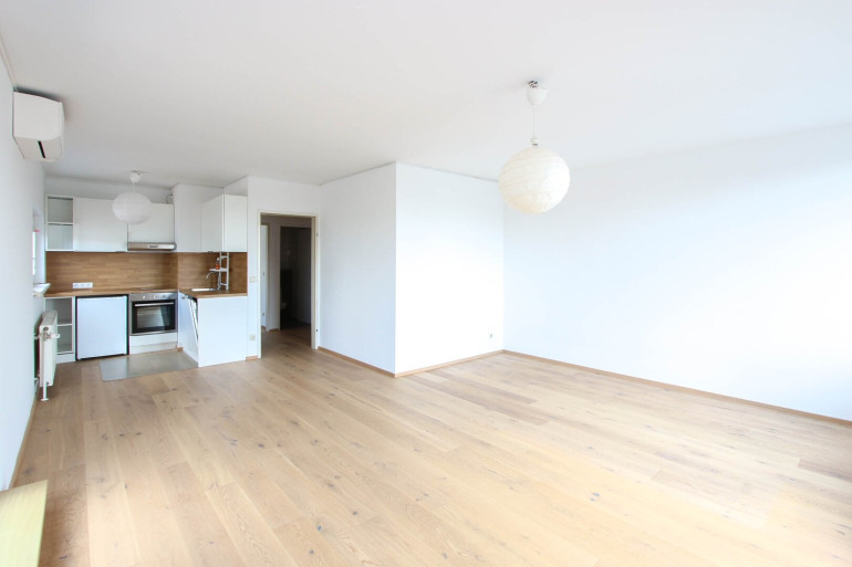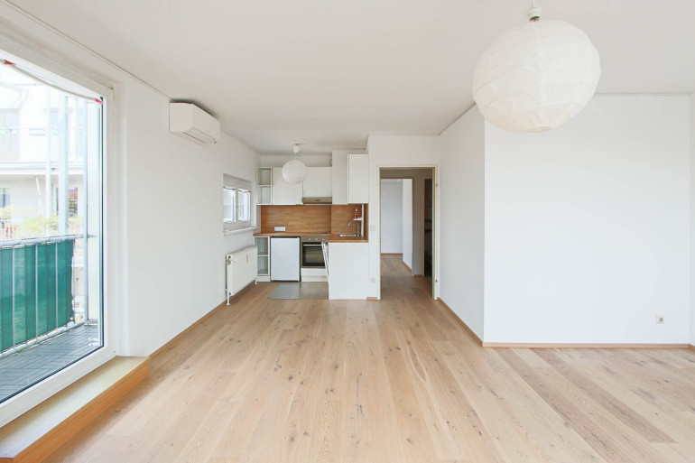 Herzstück der Wohnung ist der helle Wohnbereich mit offener Küche, der ein angenehmes Wohnambiente schafft und direkten Zugang zu den beiden weitläufigen Loggien bietet.