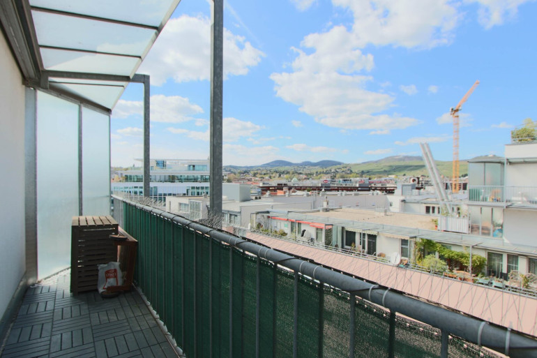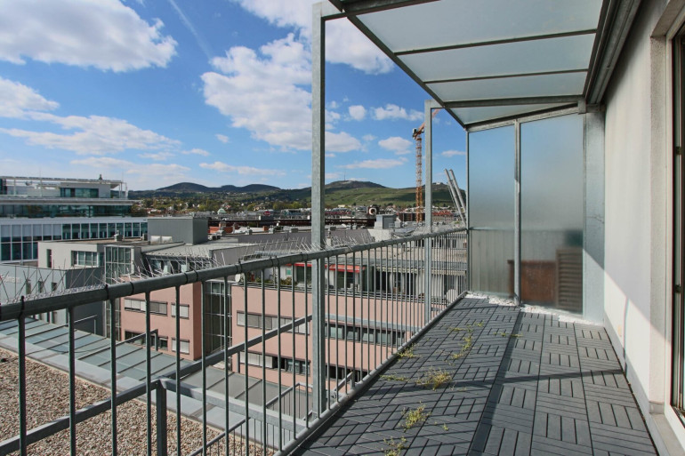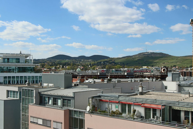 Dank der großen Fensterflächen ist die Wohnung lichtdurchflutet und bietet – ebenso wie von den Loggien aus – einen beeindruckenden Ausblick vom Kahlenberg bis hin zum Schneeberg.