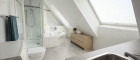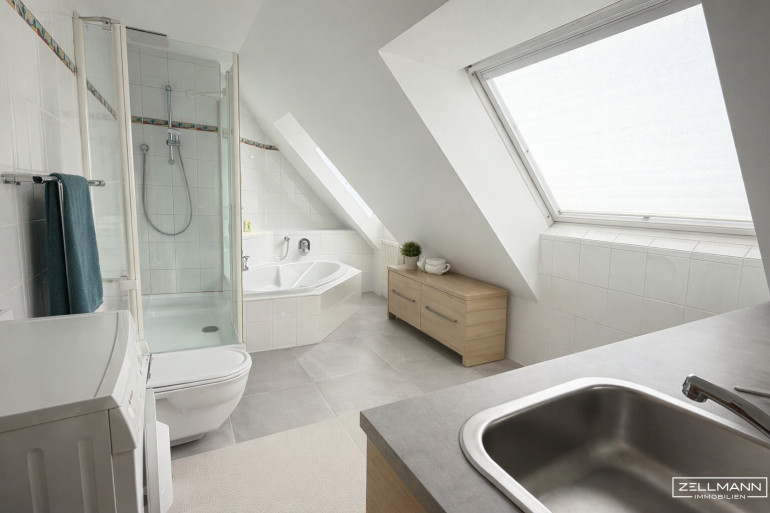 Das obere Badezimmer bietet deutlich mehr Großzügigkeit und Komfort. Neben einer Dusche steht hier auch eine Badewanne zur Verfügung. Durch die Dachflächenfenster entsteht eine angenehme natürliche Belichtung, die dem Raum eine helle und freundliche Atmosphäre verleiht.