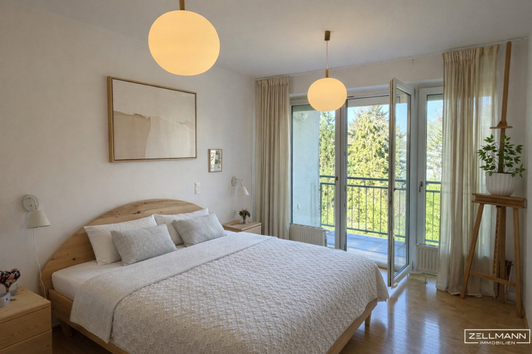 Vom Hauptschlafzimmer aus gelangen Sie direkt auf einen eigenen Balkon – ein ruhiger, geschützter Rückzugsort mit Blick ins Grüne. Auch hier zeigt sich die besondere Qualität der Lage: selbst in den privaten Bereichen begleitet Sie die angenehme Weite und Ruhe dieser Umgebung.