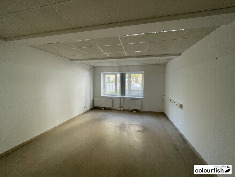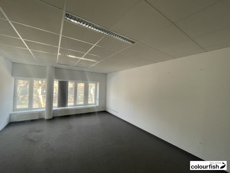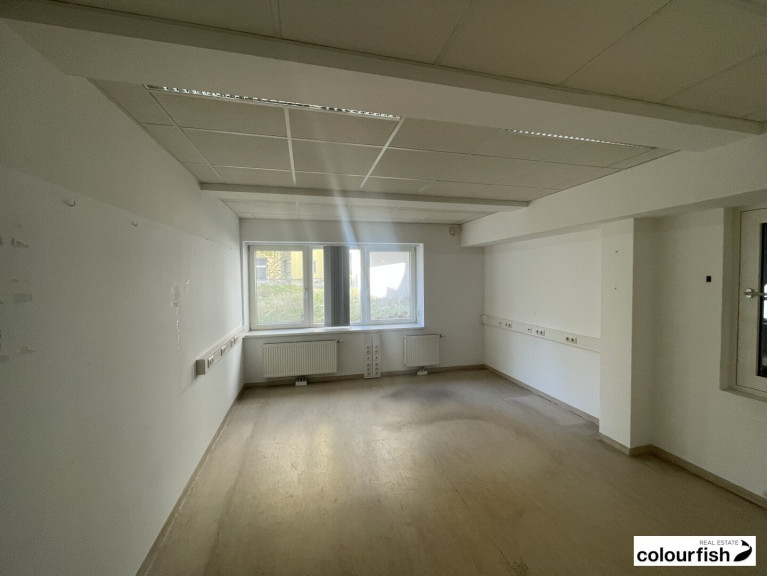 Das zugehörige Büro liegt im 1. Stock und ist über das Haus Stiegenhaus erreichbar. Der Lift hält nicht im 1. OG, das Büro ist daher nur über Stiegen erreichbar. Der Grundriss gliedert sich in drei Büroräume, 1 Wc, eine Miniteeküche Vorraum und zwei kleine Archivflächen. Die drei Büroräume wurden vom Vormieter mit Deckenspligeräten zur Kühlung ausgestattet. Die Räume blicken zur Straße bzw. zum Innenhof. Zur Halle gibt es ein öffenbares Fenster und direkten Sichtkontakt.