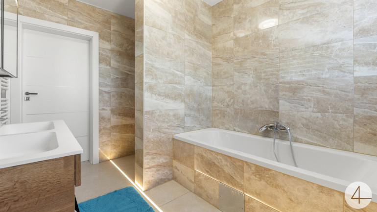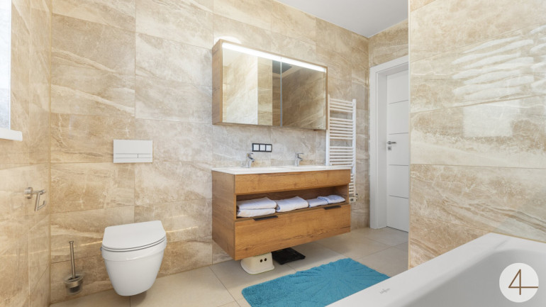 Ein modernes Badezimmer hochwertige 3-fach verglaste Kunststoff-Alufenster sowie außenliegende Rollläden unterstreichen den gehobenen Ausstattungsstandard.