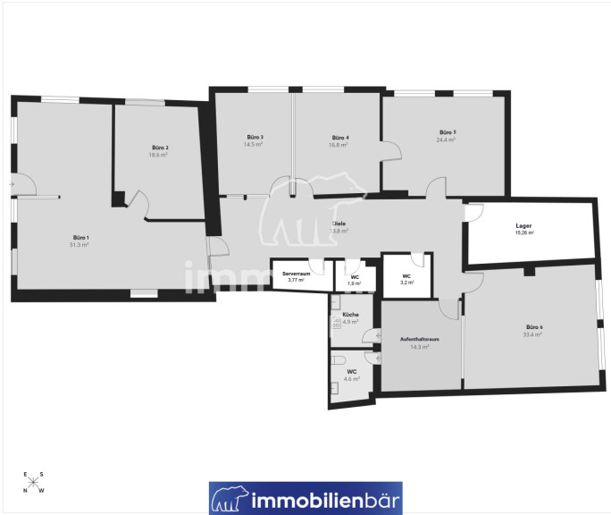 - Aktuell unterteilt in 6 helle Räume mit flexibler Gestaltungsmöglichkeit