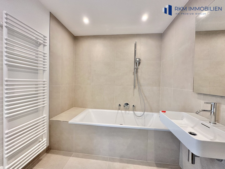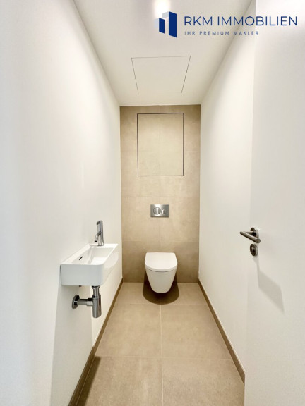 - Böden: Edler Eichen-Fertigparkett in Wohn- und Schlafräumen sowie hochwertiges Feinsteinzeug in Bad und WC