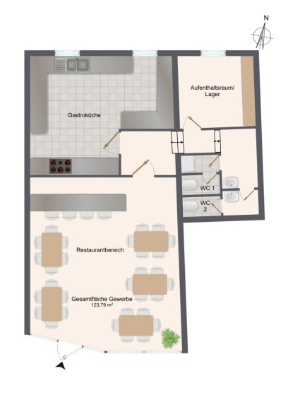 - Funktionale Rückzone: Im hinteren Bereich befinden sich die voll ausgestattete Gastro-Küche, ein separater Mitarbeiterraum sowie getrennte Sanitäranlagen für Damen und Herren.