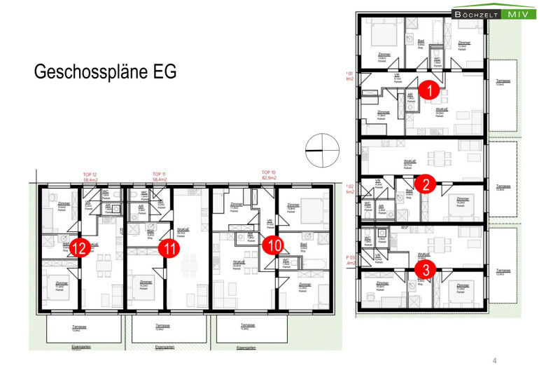 - Heizung: Gastherme je Einheit, Fußbodenheizung in allen Räumen