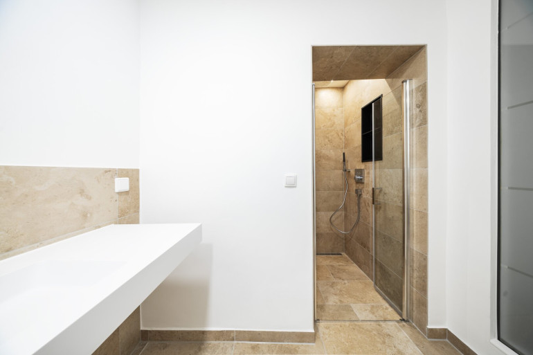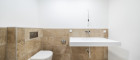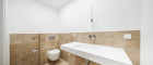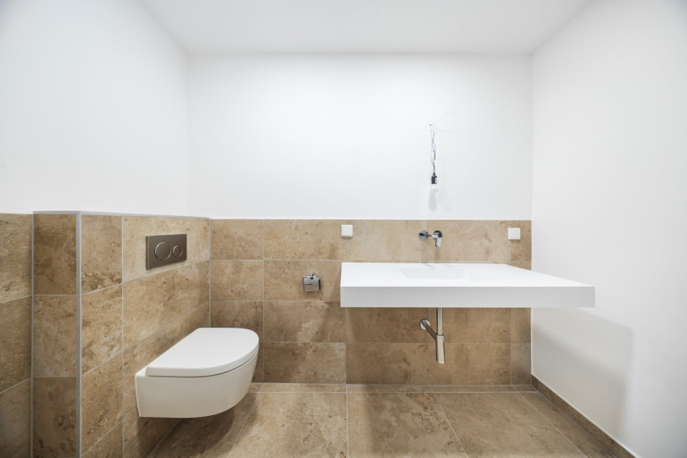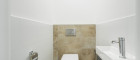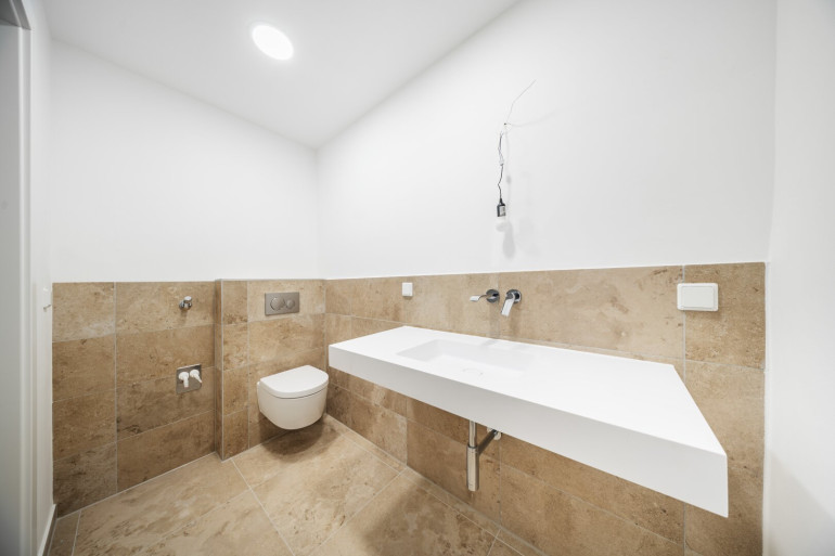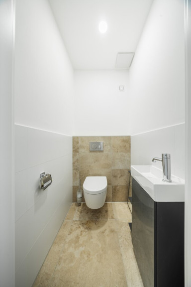 Die Wohnung verfügt über ein modern ausgestattetes Badezimmer mit Dusche und WC sowie ein separates Gäste-WC, was zusätzlichen Komfort im Alltag bietet.