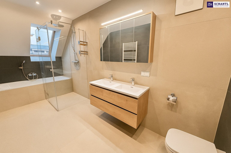 Das Badezimmer mit Badewanne, Dusche, WC und Tageslichtfenster überzeugt durch hochwertige Ausstattung und geschmackvolles Design. Ein Abstellraum mit Waschmaschinenanschluss sowie ein separater Einlagerungsraumergänzen das Raumangebot.