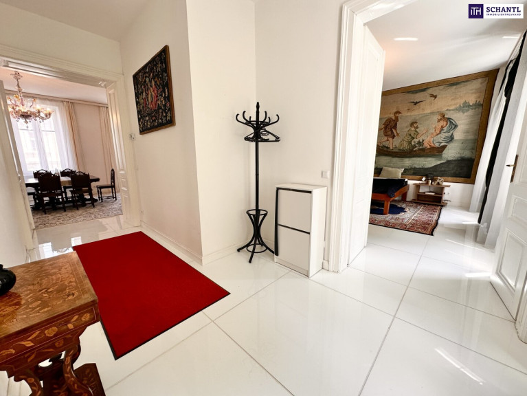 Bereits beim Betreten der Wohnung wird der besondere Charakter spürbar: kunstvolle Stuckdecken, elegante Kristallluster und hochwertiges Echtholzparkett verleihen den Räumen eine zeitlose, repräsentative Ausstrahlung. Die Wohnung verfügt über insgesamt vier Zimmer, zwei Badezimmer, einen Schrankraum sowie eine separate Küche und bietet damit viel Platz für anspruchsvolles Wohnen auf hohem Niveau.