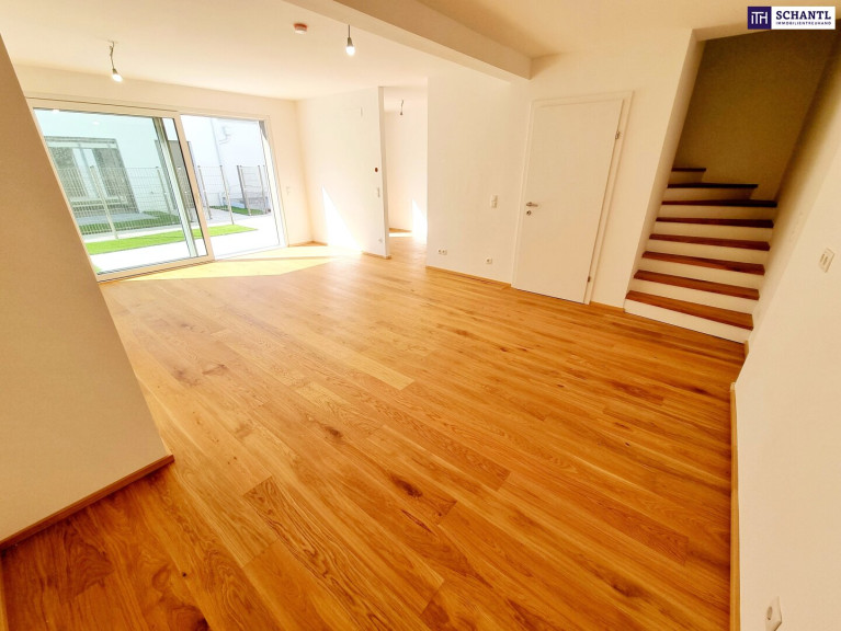 Hausfeeling pur! Ihr neues Townhouse wird Sie begeistern und teilt sich auf der 1.Ebene in einen geräumigen Vorraum mit viel Platz für eine Garderobe und Stauraum, ein separates Gäste-WC, einen praktischen Abstellraum sowie ein lichtdurchflutetes und großes Wohn-Esszimmer mit Zugang zur Terrasse bzw. dem charmanten Garten.