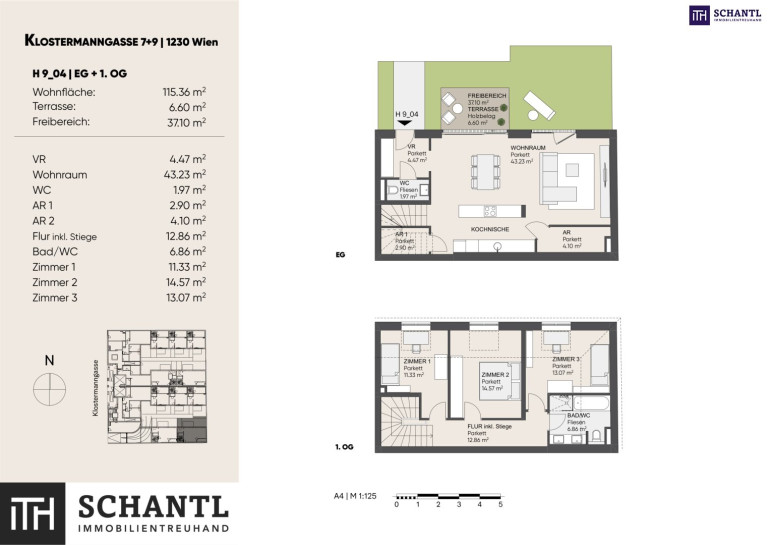 Wohnfläche: ca. 115,36m² + Terrasse: ca. 6,6m² + Eigengarten: ca. 37,10m² + Kellerabteil: ca. 9,22m²