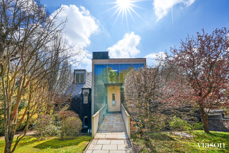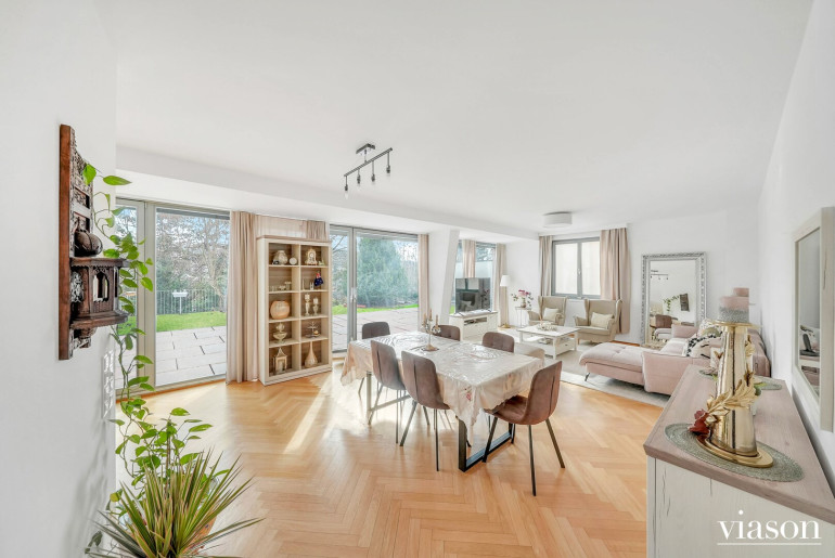 Von hier aus betreten Sie die sonnige Südterrasse und den angrenzenden Garten – eine grüne Oase mit herrlichem Ausblick, die zum Entspannen einlädt.