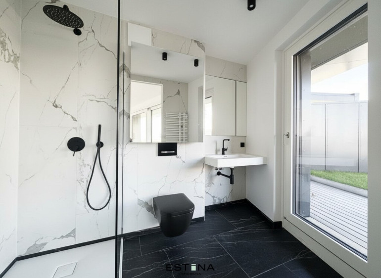 - 2 Badezimmer mit Walk-In Dusche, Waschbecken und eins mit Toilette und Zugang zur Terrasse/Dachgarten