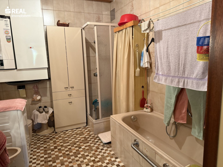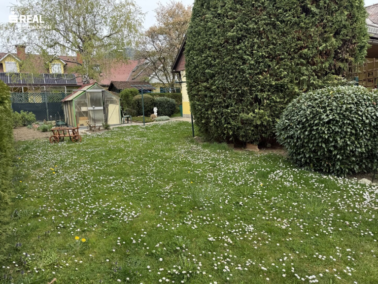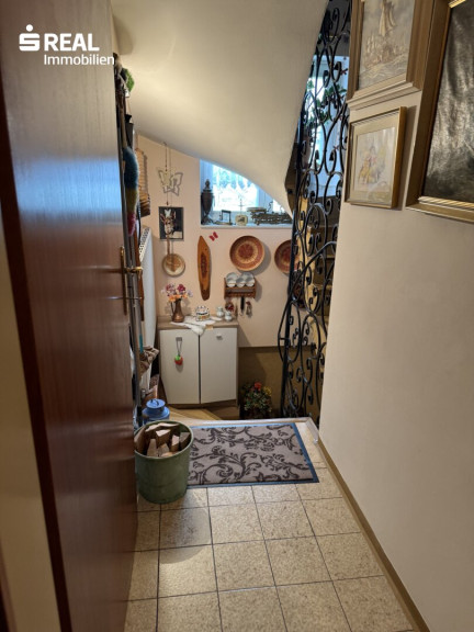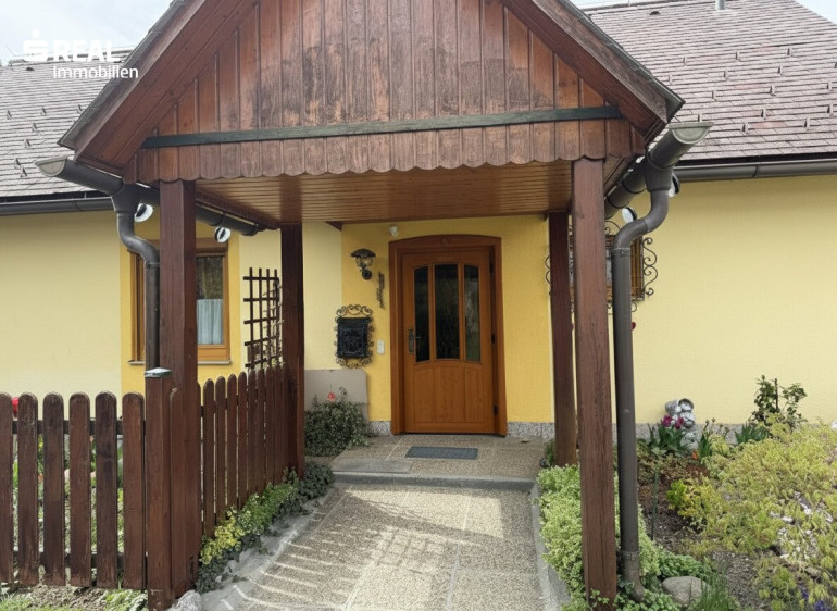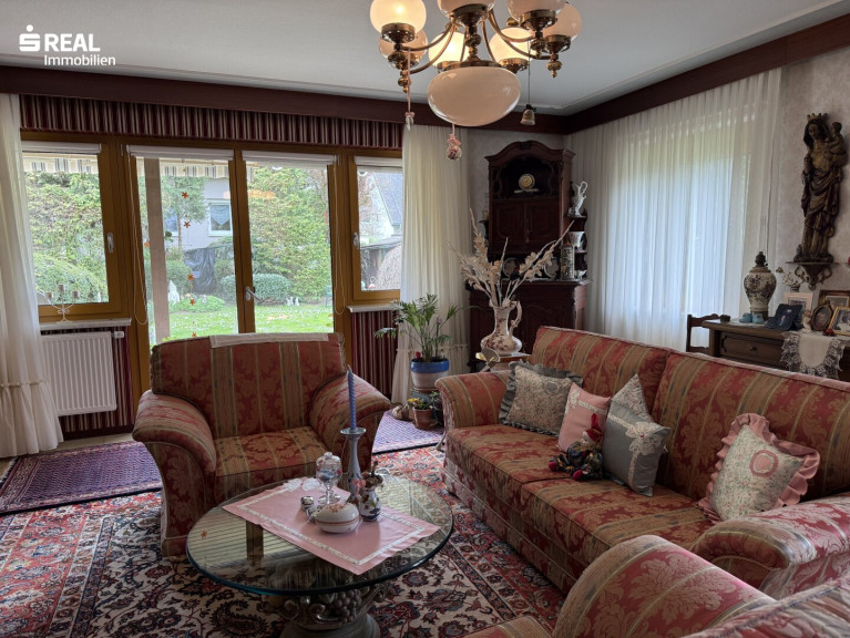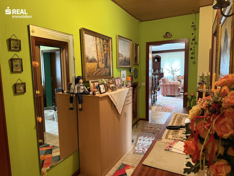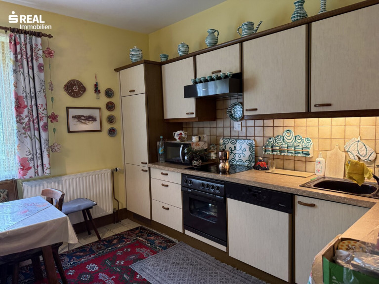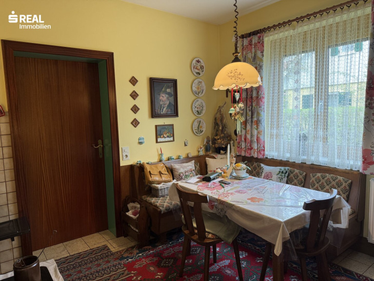 Ein einladender Vorraum führt Sie in das Herzstück des Hauses – das großzügige Wohnzimmer mit direktem Zugang zur sonnigen Terrasse und dem liebevoll angelegten Garten. Die Küche mit gemütlicher Essecke und traditioneller Kaminecke lädt zu geselligen Stunden ein.