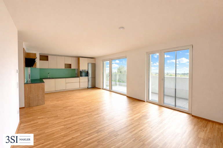 Das Herzstück der Wohnung ist der weitläufige Wohn- und Essbereich mit moderner EWE-Küche – ein Ort, an dem gemeinsam gekocht, gelacht und gelebt wird. Große Fensterflächen durchfluten den Raum mit Licht und führen direkt auf den südlich ausgerichteten Balkon. Genießen Sie hier sonnige Stunden oder laue Sommerabende mit Blick ins Grüne.