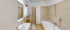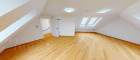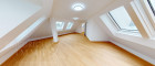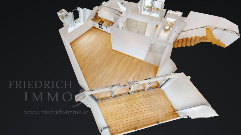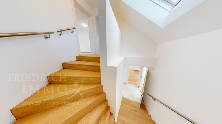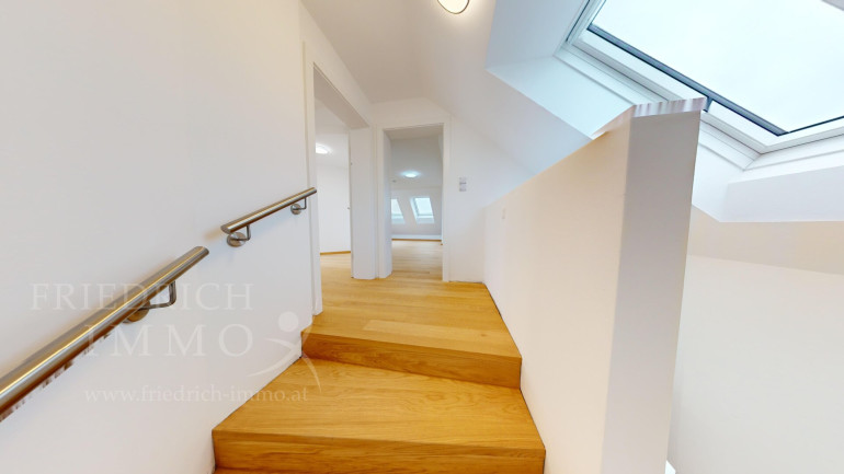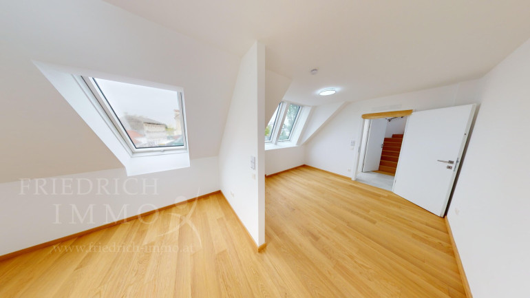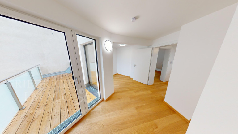 Im unteren Stockwerk verbindet ein offener Wohn-, Ess- und Kochbereich mit Markenküche den Übergang zur 10,50 m² großen Terrasse. Daneben bieten ein separater Schlafbereich mit Schrankraum, ein großzügiges Badezimmer mit Badewanne und Dusche sowie eine getrennte Toilette viel Platz und Privatsphäre. Im Obergeschoss führt ein Vorraum zur Loggia und zu einem weiteren Raum, der als Schlafzimmer oder Home-Office genutzt wird. Geölter Eichenparkett, Feinsteinzeug, Fußbodenheizung und elektrischer Sonnenschutz gehören zur Standardausstattung. Das Penthouse ist über den Personenlift barrierefrei erreichbar.