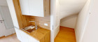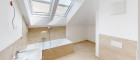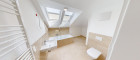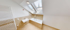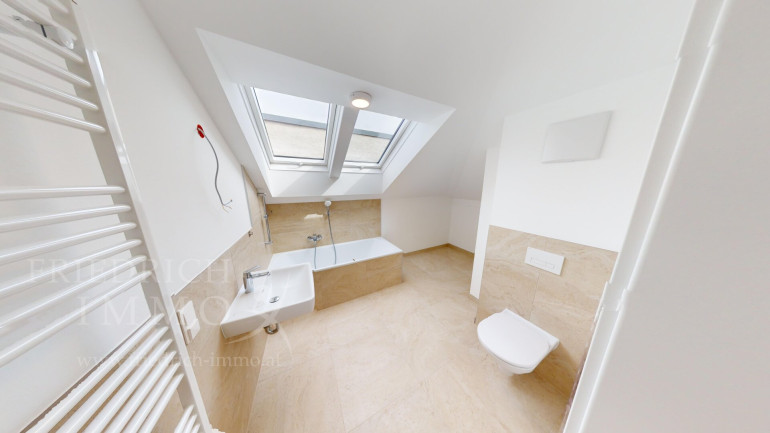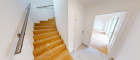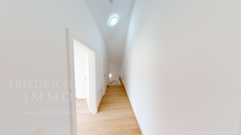 Im Obergeschoss liegt das moderne Badezimmer mit Badewanne, Waschbecken, Handtuchheizung und Anschlüssen für Waschmaschine und Trockner. Zwei getrennt begehbare Schlafzimmer bieten Privatsphäre und flexible Nutzungsmöglichkeiten. Geölter Eichenparkett, Feinsteinzeug, Fußbodenheizung und Dreifachverglasung sorgen für den gewohnt hohen Ausstattungsstandard des gesamten Projekts.