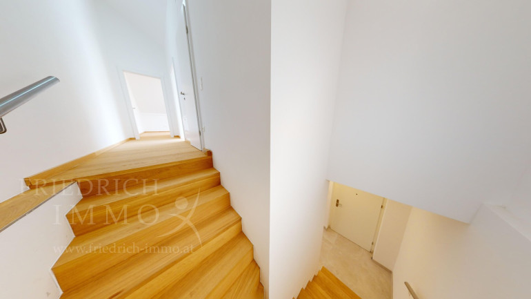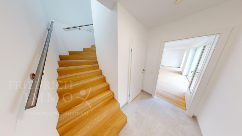 Im Erdgeschoss empfängt ein Eingangsbereich mit separater Gästetoilette. Von hier öffnet sich der großzügige Wohn-Essbereich mit offener Markenküche und praktischem Abstellraum. Das Highlight: der direkte Zugang zum privaten Garten, der den Wohnraum im Freien um über 60 m² erweitert – ideal für Familien und ein entscheidender Faktor für die langfristige Vermietbarkeit. Eine zusätzliche Terrasse von 9,60 m² ergänzt den Außenbereich.