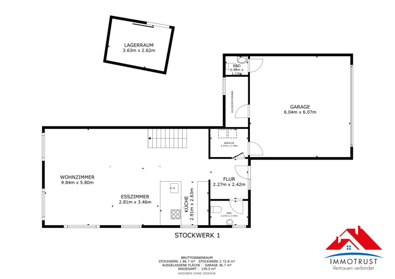 Dieses hochwertige Einfamilienhaus in Völkermarkt überzeugt mit moderner Architektur, großzügiger Raumaufteilung und einem äußerst gepflegten Gesamtzustand. Auf ca. 161,2 m² Wohnfläche und ca. 847,5 m² Grundstücksfläche bietet die Immobilie viel Platz für Familien, Paare mit gehobenem Anspruch oder Käufer, die ein modernes Haus in Kärntenin absoluter Ruhelage suchen. Das Haus wurde 2019 errichtet, ist voll erschlossen, in Massiv- und Stahlbetonbauweise ausgeführt und laut Exposé als Neubau mit offener Wohnküche, Gäste-WC, Bad mit Fenster und Dusche, Süd- und Westterrasse sowie Garagenfläche von ca. 36,7 m² ausgestattet.