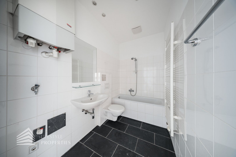 Fliesen, Parkett, Zentralheizung, Einbauküche, Wohnküche / offene Küche, Personenaufzug, Badewanne
