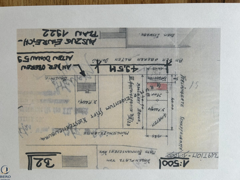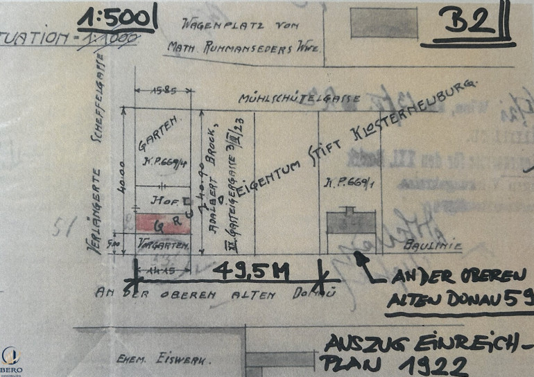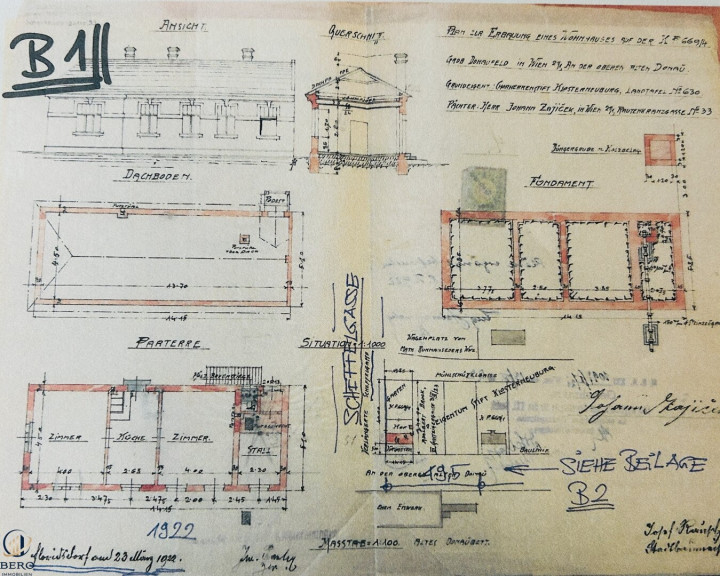 Es gibt keine planschen Unterlagen über die Bauwerke auf dieser Liegenschaft. Bei der MA37 wurde eine Einreichplanung aus dem Jahr 1922 aus der unmittelbaren Nachbarschaft gefunden, in welcher das Wohngebäude bereits eingetragen war.