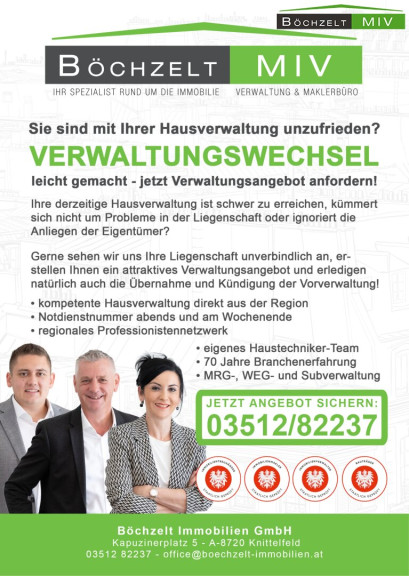 - Aktuelle monatliche Vorschreibung (BK, Rücklage, Heizung, Wasser/Kanal) rund EUR 315,- brutto