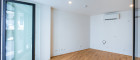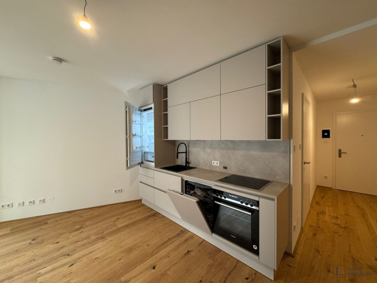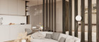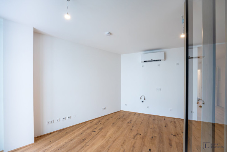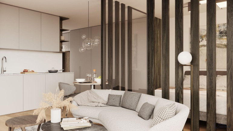 Durch den kompakten Flur gelangen Sie in das Wohnzimmer mit offener Küche, das auf einen Balkon mit Blick auf den Innenhof führt. Dies ist der perfekte Ort für einen morgendlichen Kaffee oder einen entspannten Abend nach einem anstrengenden Tag. Das Schlafzimmer ist durch ein interessantes Designer-Element, elegante Lamellen, die Tageslicht einlassen und dem Wohnraum viel Luft geben, vom Wohnzimmer abgetrennt.
