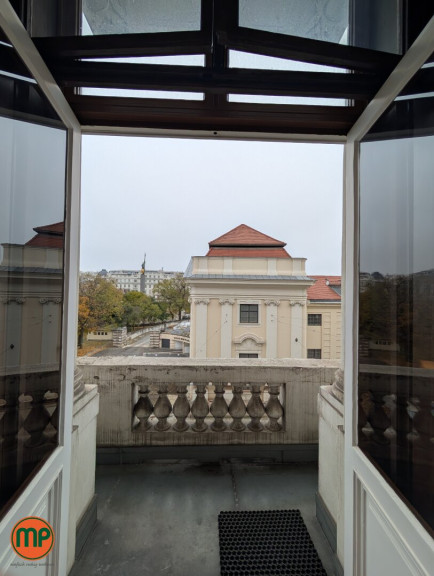 Besonderes Highlight sind die zwei Balkone. Während einer zum ruhigen Innenhof orientiert ist, bietet der Hauptbalkon eine erhabene Aussicht direkt auf den Schwarzenbergplatz. Dieser „Logenplatz“ eignet sich perfekt für kurze Pausen oder um Gäste in einem beeindruckenden Rahmen zu empfangen.