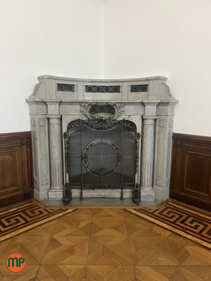 Architektonische Akzente: Drei kunstvoll gefertigte Steinkamine, darunter ein Prunkstück aus edlem Marmor, dienen als Blickfang und unterstreichen den Charakter der Räume.