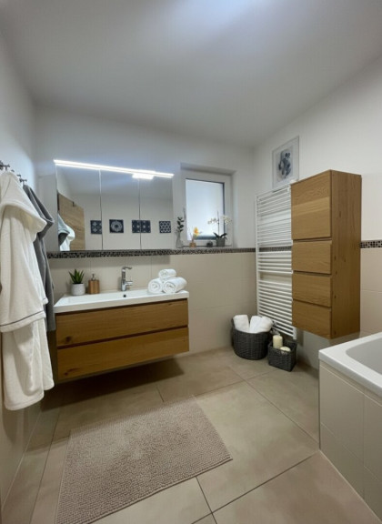 Fliesen, Steinboden, Parkett, Fußbodenheizung, Zentralheizung, Bad mit Fenster, Badewanne, Dusche