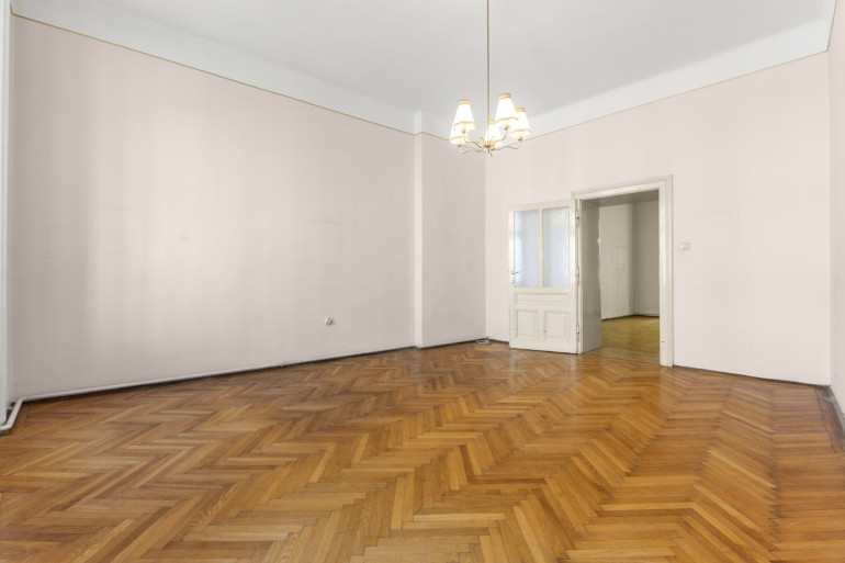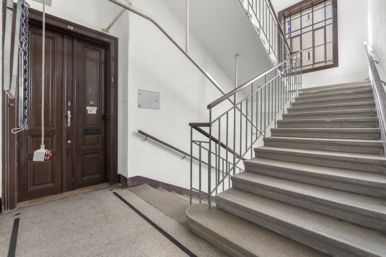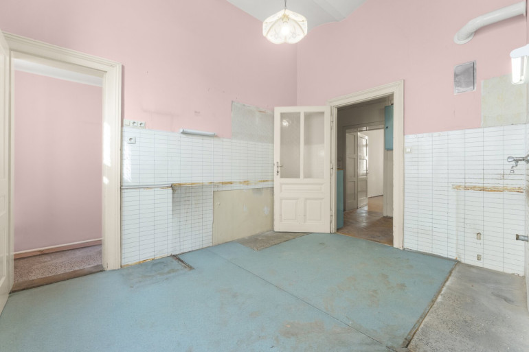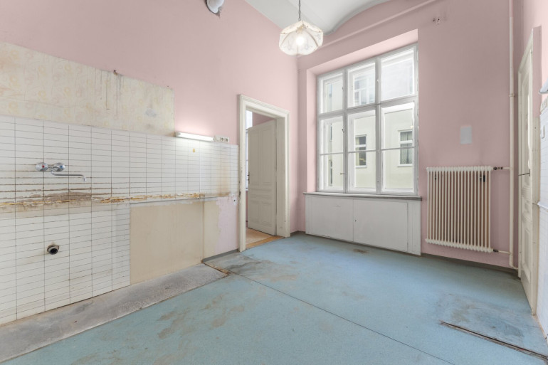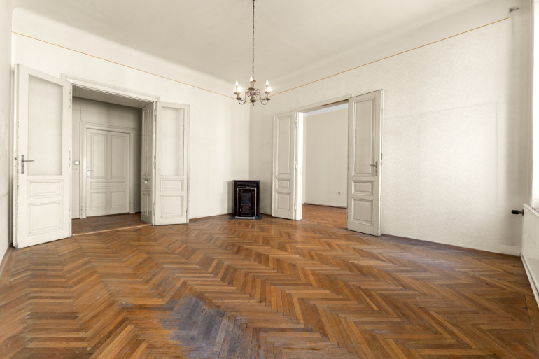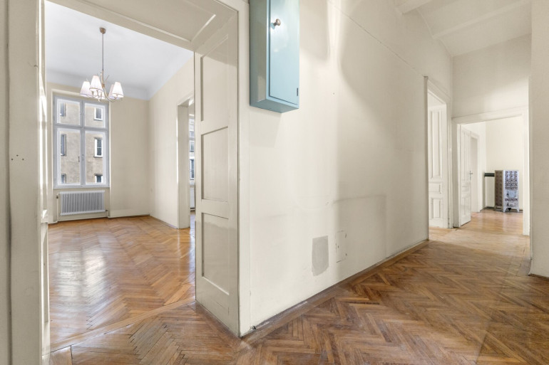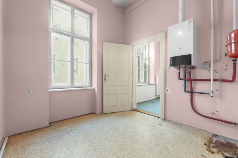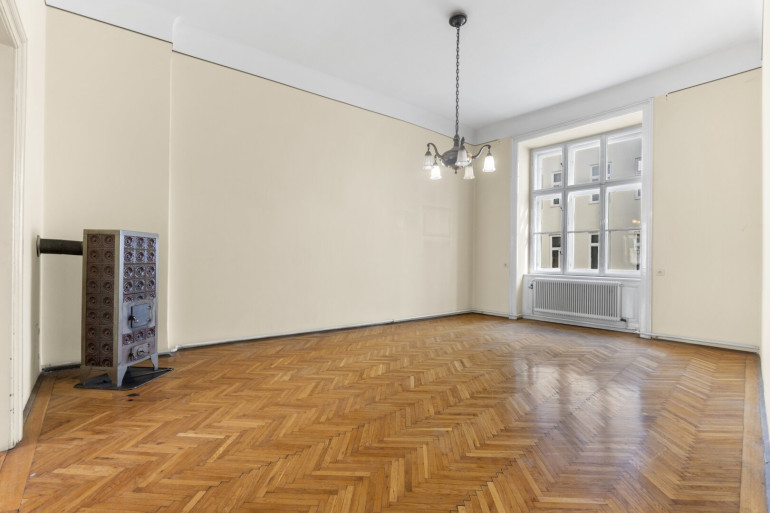 Die Wohnung befindet sich im 2. Stock (ohne Lift) und in einem sanierungsbedürftigen Zustand. Sie bietet sehr viele Elemente eines Stilaltbaus: