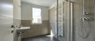 - Tageslicht Badezimmer mit Dusche, Waschbecken, Waschmaschinenanschluss und Handtuchtrockner