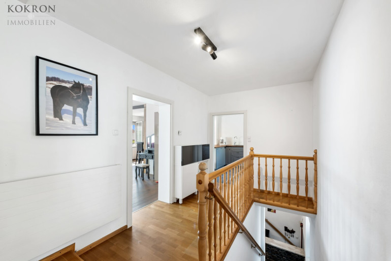 Über die zentrale und geradläufige Holzstiege gelangen Sie in das Obergeschoss.